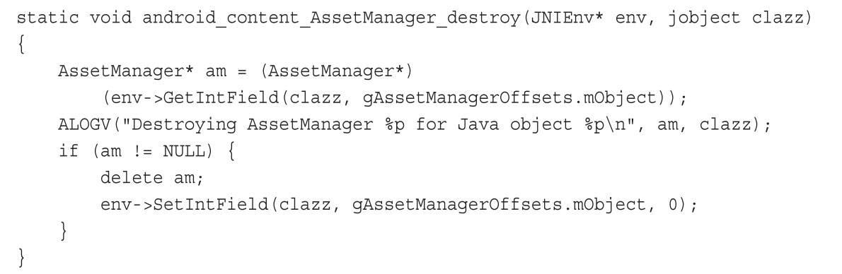 可以看到,首先,它析构了 native 层的 AssetManager,然后把 java层的 AssetManager 对 native 层的 AssetManager 的引用设为空。