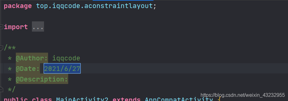 你会发现为什么刚才设置的没有作用是吧!其实刚刚只是一种模板,我们在import跟public class直接输入刚刚给模板定义的名称author你就会看到如下效果: