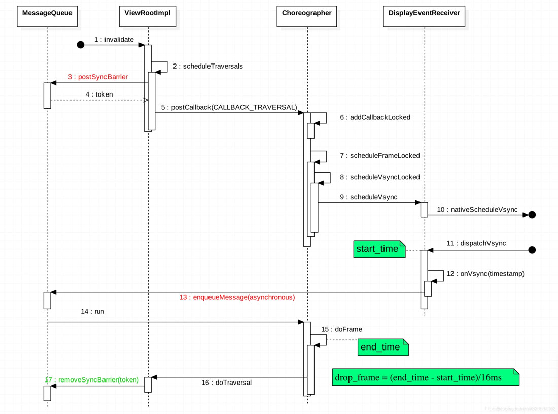 可以发现,每一帧时间都是固定的。所以一旦一个Message 的处理时间超过了 16.6ms 就会引起卡顿。