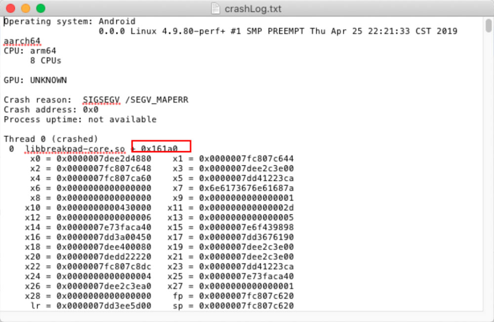 3、根据解析出的NE信息,关注图中红框,可以得知,这个崩溃发生的libbreakpad-core.so里面,0x161a0代表崩溃发生在相对根位置偏移161a0的位置