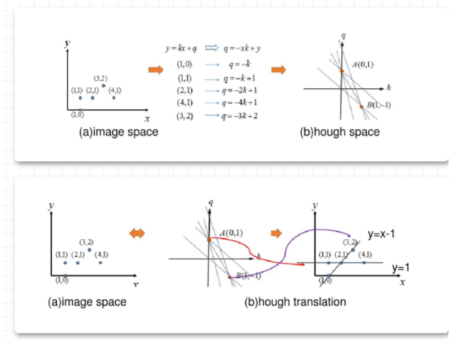 - 图像空间中的点,对应霍夫空间中的直线