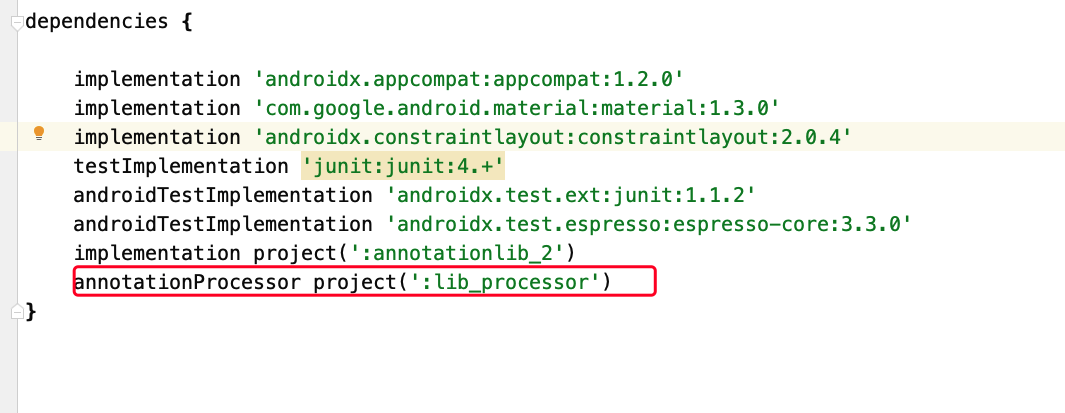 我们再新建一个Javalib,只放BindView即可,然后让我们的lib_processor和app 都依赖这个lib_interface即可。再稍微修改一下代码,此时我们是编译期处理,所Policy不用是runtime了。
