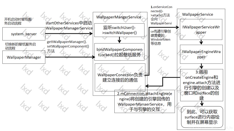 壁纸服务的启动相比于普通服务的启动较为复杂,接下来用下面的示意图对整体的流程进行梳理: