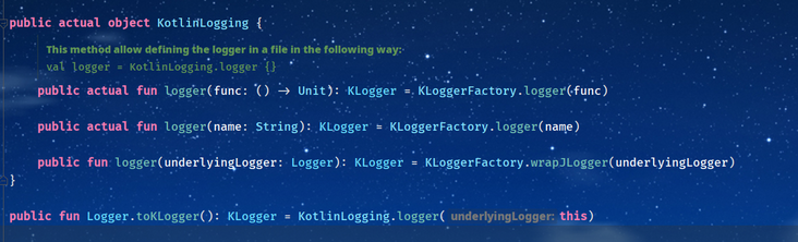 当然,也可以将注解与kotlin-logging结合一下使用,首先,笔者简单地看了一下KotlinLogging的接口: