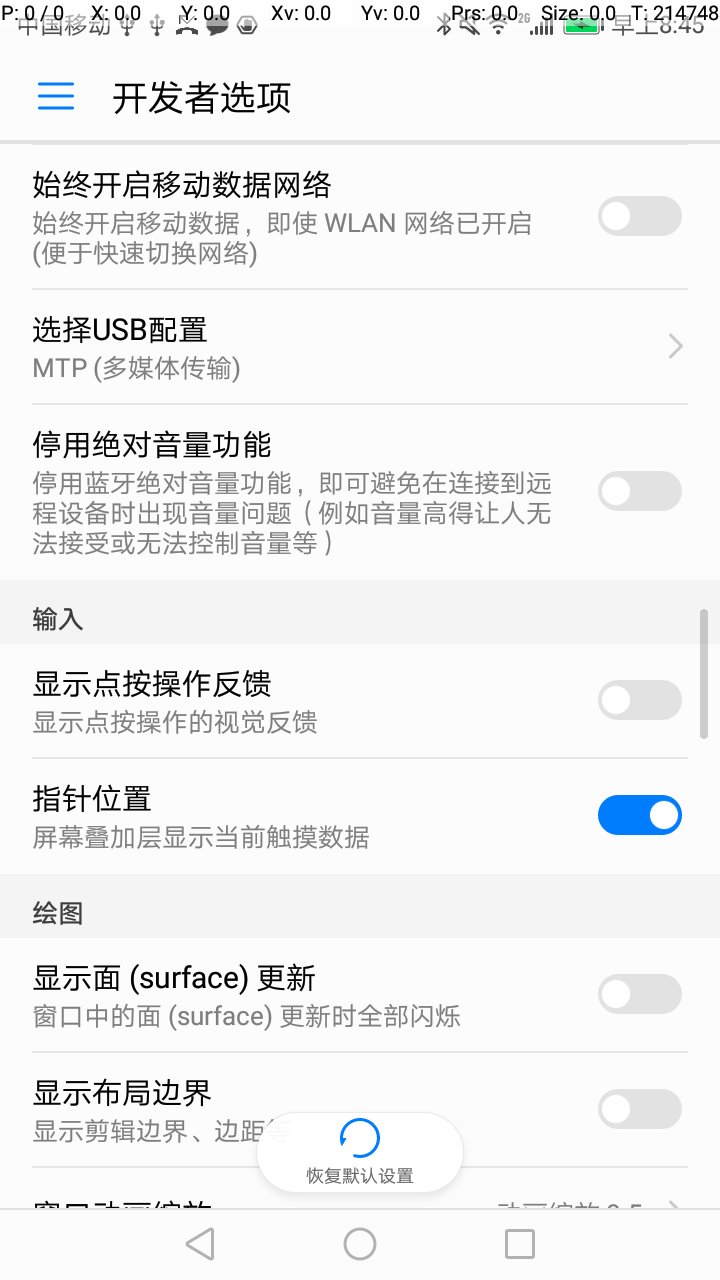 我们可以打开手机中的 开发者选项 -> 指针位置 来辅助定位,可以再上方看到x,y相对的偏移量。