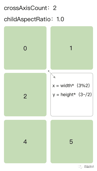 对于横坐标,我们已经根据crossAxisCount来对屏幕宽度进行了等分,那么每个卡片的横坐标就很容易得到了,我们用卡片的index对crossAxisCount进行整除取余,这样就能得到卡片在某一行中的顺序(即第几列),然后再乘上卡片的宽度,这样就可以得到卡片的横坐标了。