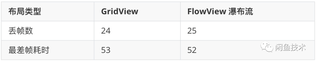 然后我们对GridView和FlowView进行了性能测试,使用脚本对两个滚动容器分别往下滚动五次,再滚动五次。最后得出性能数据,然后我们主要关注两个数据,分别是最大丢帧数和最差帧耗时,这往往就是最影响体感的两个数据。通过根据平均卡片尺寸高度动态调整分页,最后的性能数据达到了尽可能和GridView一致。使用同一机型,性能测试数据如下: