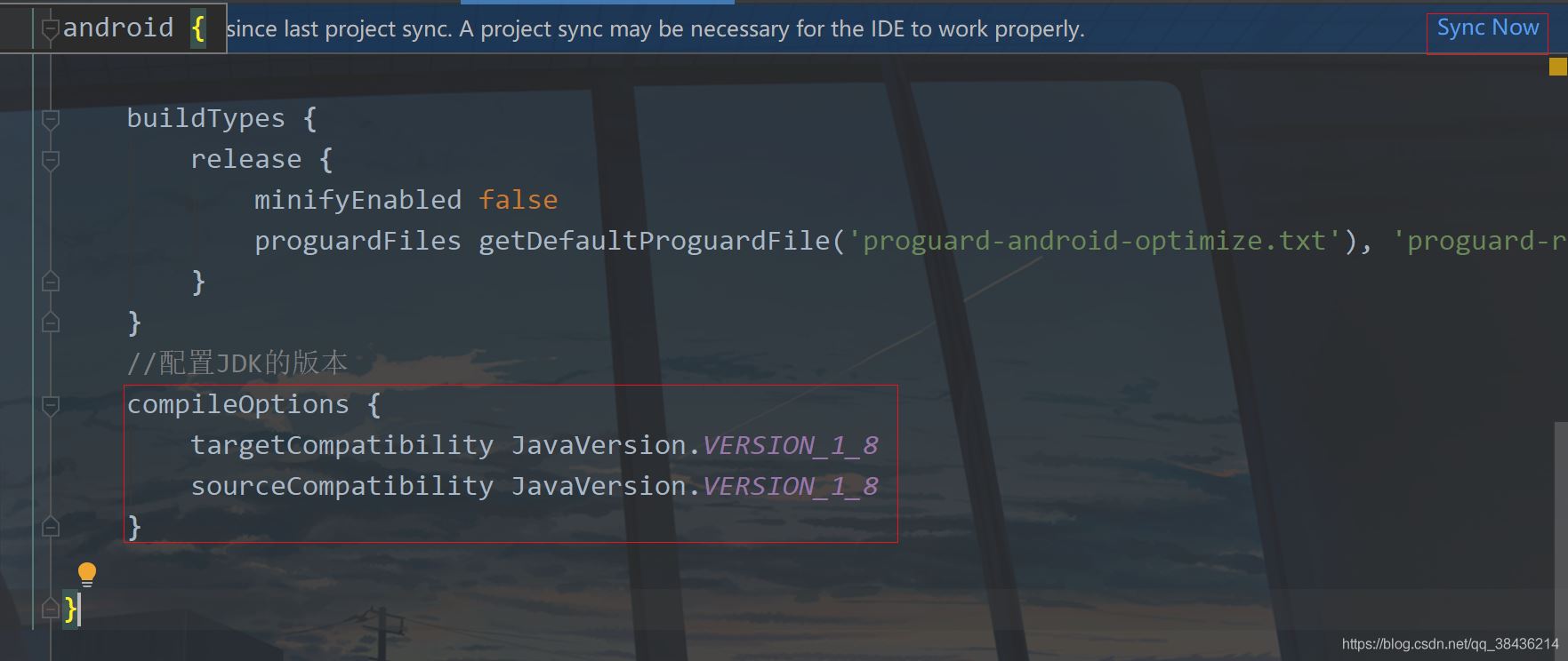 这里是配置JDK的版本,为1.8,我个人最喜欢的版本。一旦项目中的build.gradle有改动,便会出现Sync Now或者Sync的同步提示,如下图所示: