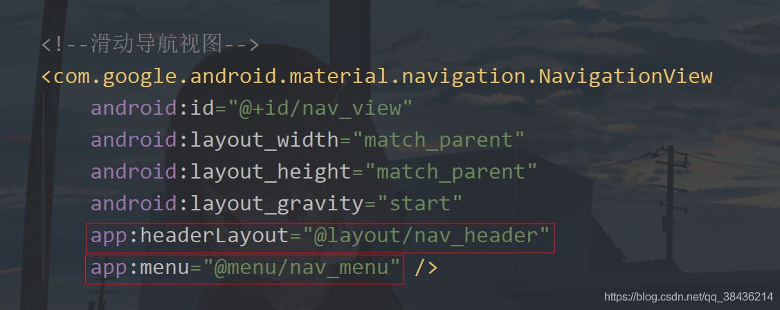 <?xml version="1.0" encoding="utf-8"?> <androidx.drawerlayout.widget.DrawerLayout xmlns:android="http://schemas.android.com/apk/res/android" xmlns:app="http://schemas.android.com/apk/res-auto" xmlns:tools="http://schemas.android.com/tools" android:id="@+id/drawer_layout" android:layout_width="match_parent" android:layout_height="match_parent" tools:context=".MainActivity"> <!--主页面布局--> <LinearLayout android:layout_width="match_parent" android:layout_height="match_parent" android:background="@drawable/bg" android:fitsSystemWindows="true"> <androidx.appcompat.widget.Toolbar android:id="@+id/toolbar" android:layout_width="match_parent" android:layout_height="?attr/actionBarSize" app:navigationIcon="@drawable/icon_menu" /> </LinearLayout> <!--滑动导航视图--> <com.google.android.material.navigation.NavigationView android:id="@+id/nav_view" android:layout_width="match_parent" android:layout_height="match_parent" android:layout_gravity="start" /> </androidx.drawerlayout.widget.DrawerLayout>