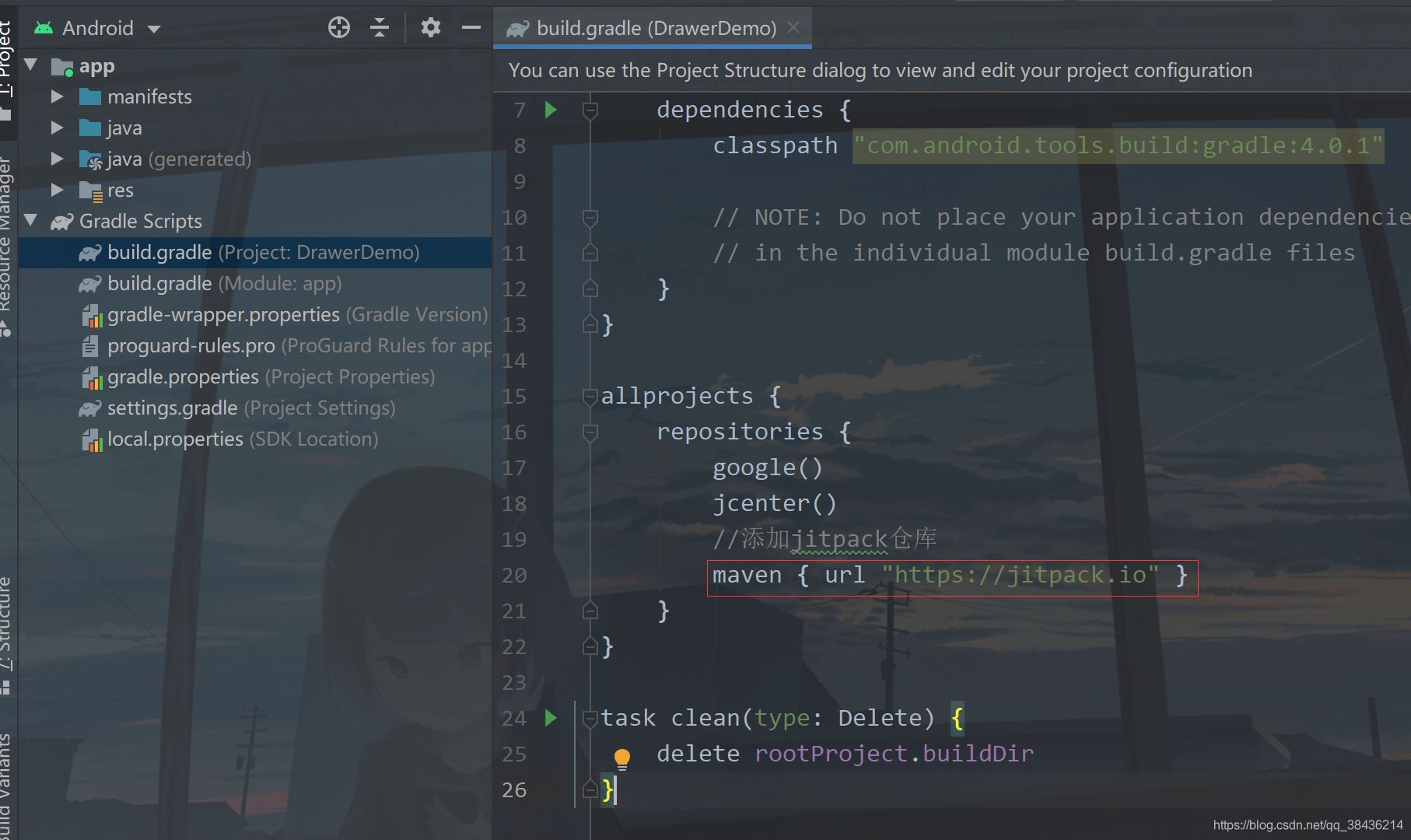 然后打开app下的build.gradle,在android{}闭包中添加如下代码: