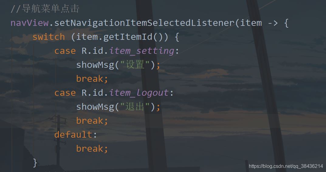 toolbar = findViewById(R.id.toolbar); //工具栏按钮点击 toolbar.setNavigationOnClickListener(v -> drawerLayout.openDrawer(GravityCompat.START));