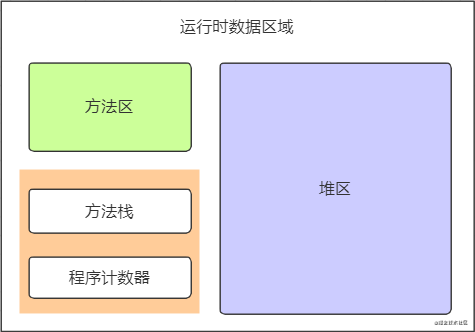 - 橙色区域的方法栈以及程序计数器属于线程私有,主要存储方法中的局部数据。