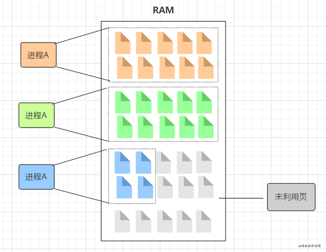 Android 采用分页存储的方式把一个进程存储到 RAM 中。分页存储,简单来说就是把内存分割成很多个小块,每个应用占用不同的小块,这些小块也可以称为页: