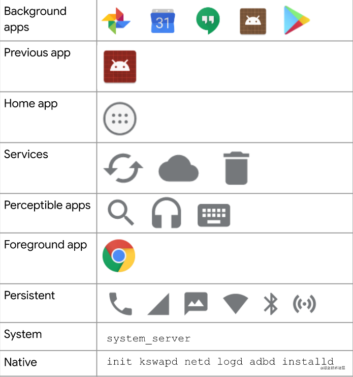 - 主屏幕应用:这是启动器应用,也就是我们的桌面。如果这个进程被kill了,那么返回桌面时会暂时黑屏。