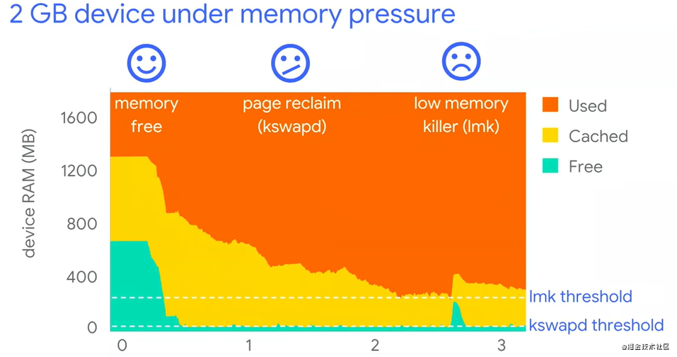 我们文章分析了 android 是如何对内存进行分配以及低内存时如何释放内存来满足内存请求。可以很明显看到,当内存不足时,会严重影响我们 app 的体验甚至整个用户手机的体验: