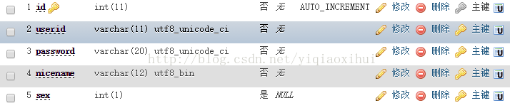 至于数据库,可以自行建立,根据上面php代码可知,数据库中有一个user表,表中有4个字段,分别是userid,password,nicename,sex.大家可自行建立即可(nicename,sex在本例中没有用到)。截图如下