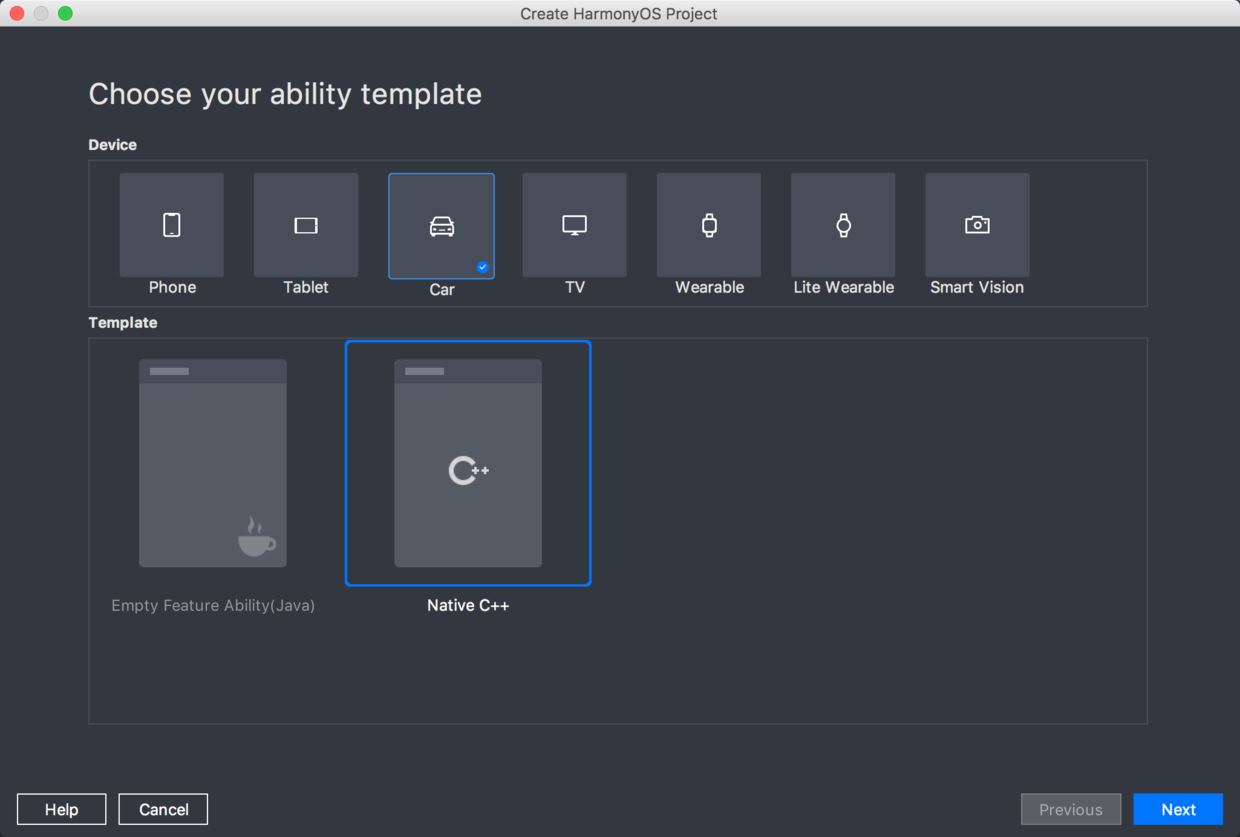 目前,通过DevEco-Studio创建创建Native C++模板类型的工程时,只有Car支持这种模板(Phone默认不包含Native C++模板)。