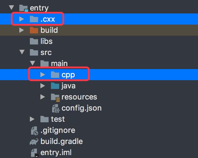 将entry下的.cxx目录和cpp目录拖拽到 libnative module中的相同位置: