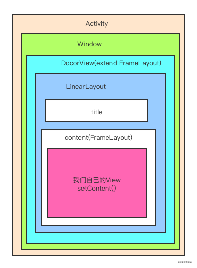 这个 LinearLayout 里有一个 id 为 content 的 FrameLayout ,我们通常设置的 setContentView() 就是加载到了这个 FrameLayout 里。