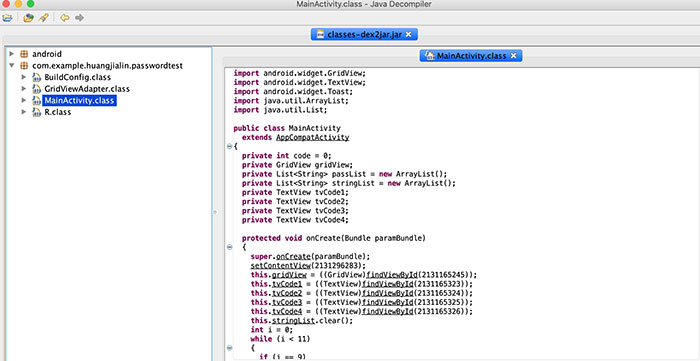 很多人就会说,你这个项目是demo,并没有做混淆,所以可以反编译出来??但是,需要知道的是,如果做了混淆,一样可以反编译出来,只不过说里面的很多类名,方法名,变量名等等都是以a,b,c这样的形式存在,但是这种并不影响能过看出你的代码逻辑,只是给阅读增加了一丝的难度而已。所以,项目做混淆,只是最基础的一种方式,还有很多很多我们需要考虑的。