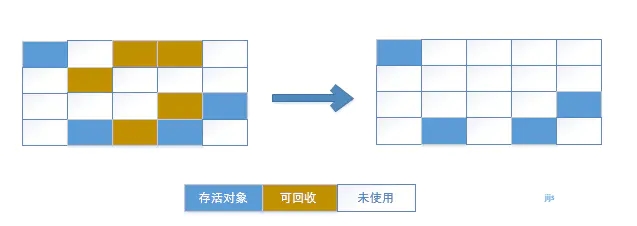 标记-整理算法在标记-清除算法的基础上做了改进,标记阶段将可回收的对象标记出来,标记完成后不是直接对可回收的对象进行清理,而是让所有存活的对象都向一端移动,在移动的过程中清理掉可回收的对象。