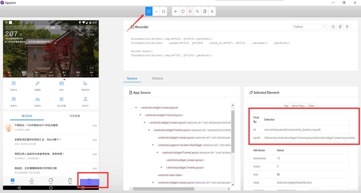 通过Appium,我们可以模拟点击和屏幕的滑动,可以获取元素的id和classname,还可以根据操作生成相关的脚本代码。