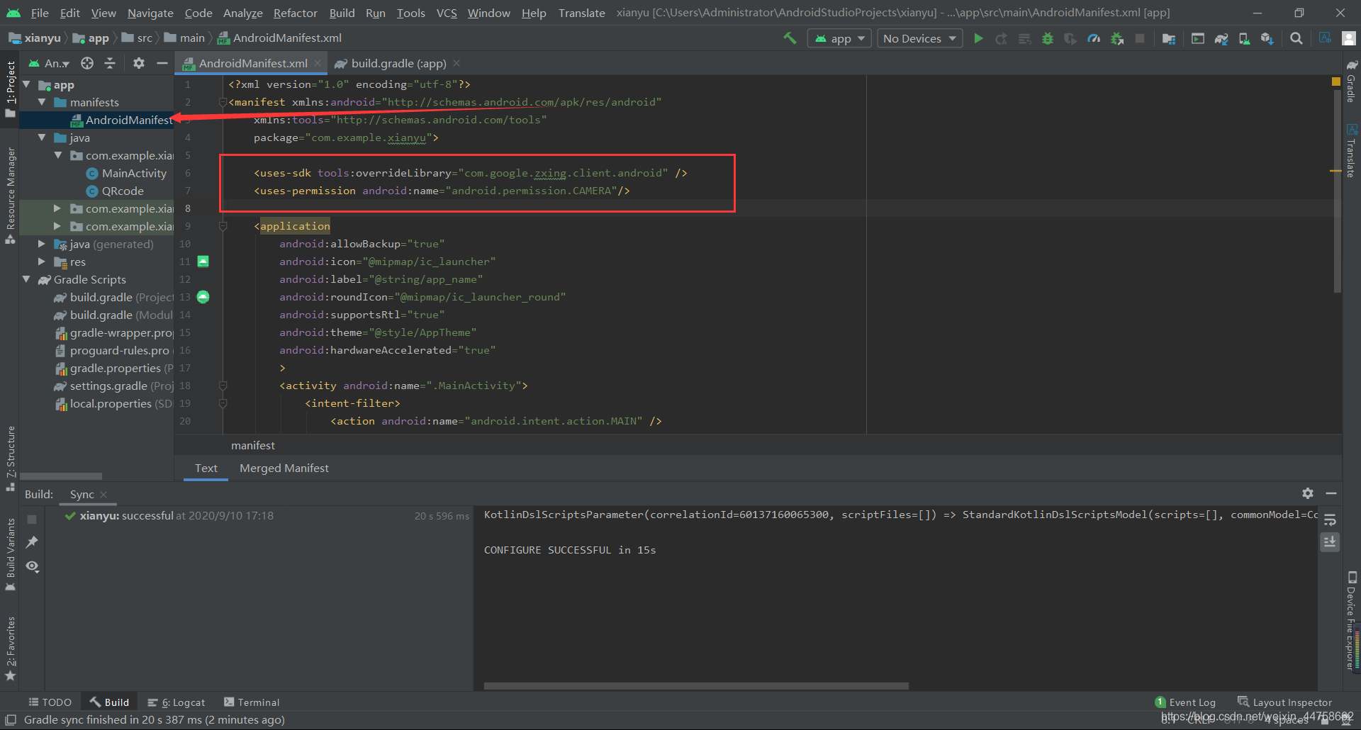 <uses-sdk tools:overrideLibrary="com.google.zxing.client.android" /> <uses-permission android:name="android.permission.CAMERA"/>
