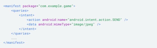 我们可以在 AndroidMainfest 中添加 <queries>来适配特定的使用场景:(该配置相当于是添加应用白名单)