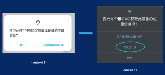 在 Android 11 中,系统为用户的私人数据提供了更多可供选择的授权方式,应用也加大了后台对位置的访问权限限制。
