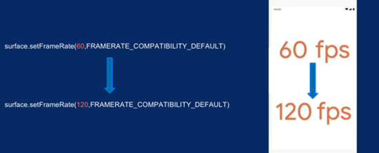 应用和游戏现在可以为其窗口设置首选帧率。大多数 Android 设备以 60Hz 的刷新率更新屏幕,但是某些设备支持多种刷新率,例如 90Hz 和 60Hz,并可在运行时切换。在这些设备上,系统会基于首选帧率来为应用选择最佳刷新率。