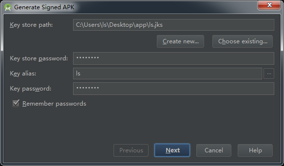 在Key store path中输入自己要用来进行签名的密钥文件的存放位置,同时输入密钥文件的读写用户名密码(如果还没有密钥文件点击图中的“Create New”进行创建即可)