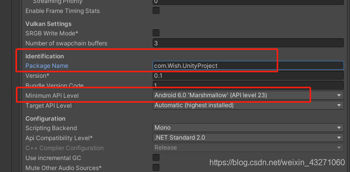 然后在Player Settings中设置Other Settings中的PackageName这个必须要与Android中的包名一致,不一致可不可以?也行,反正我试着是可以的,我用的手机是小米9pro,其他机型没试过