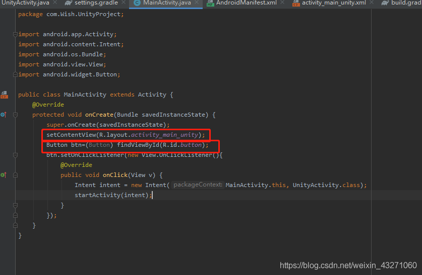 Intent intent = new Intent(MainActivity.this, UnityActivity.class);