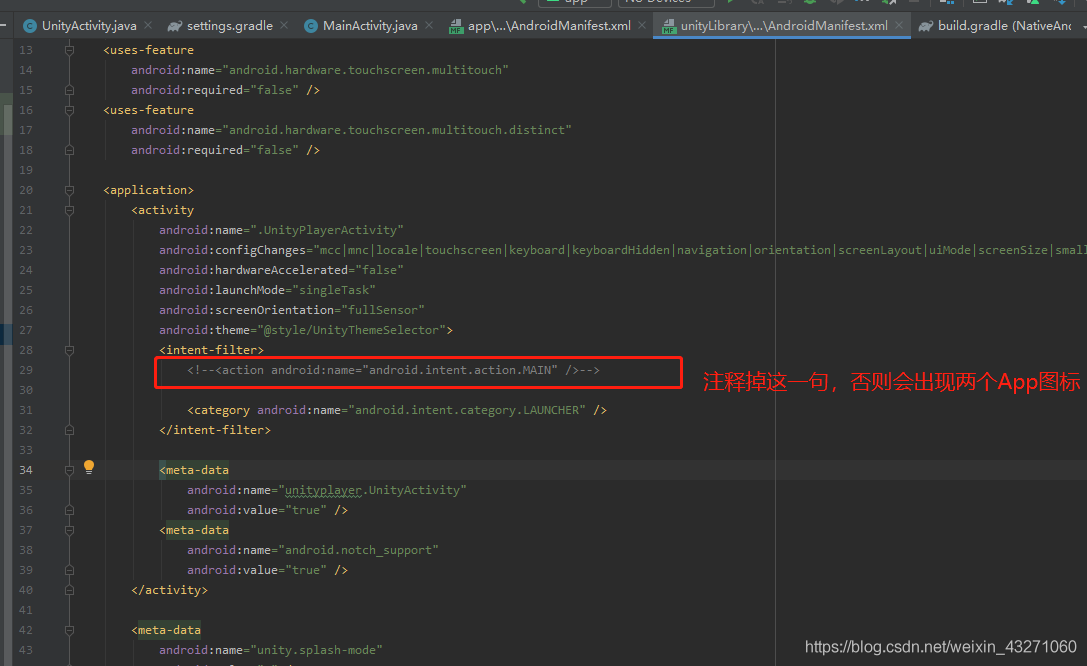 修改unityLibrary下面的AndroidManifest.xml文件