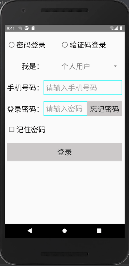3、编辑框EditText:输入手机号和密码(或验证码)。