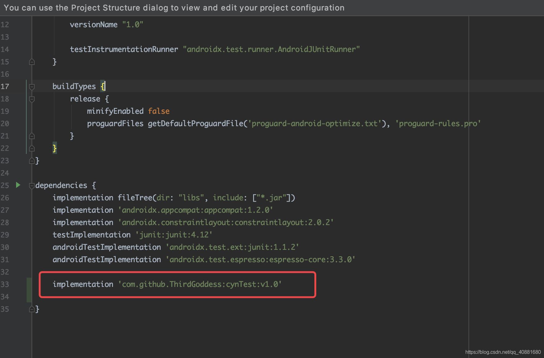 最后测试,(可以新建一个工程,新建工程轻按上方添加那条依赖和jitpack.io),删除原先创建的Module,进行测试