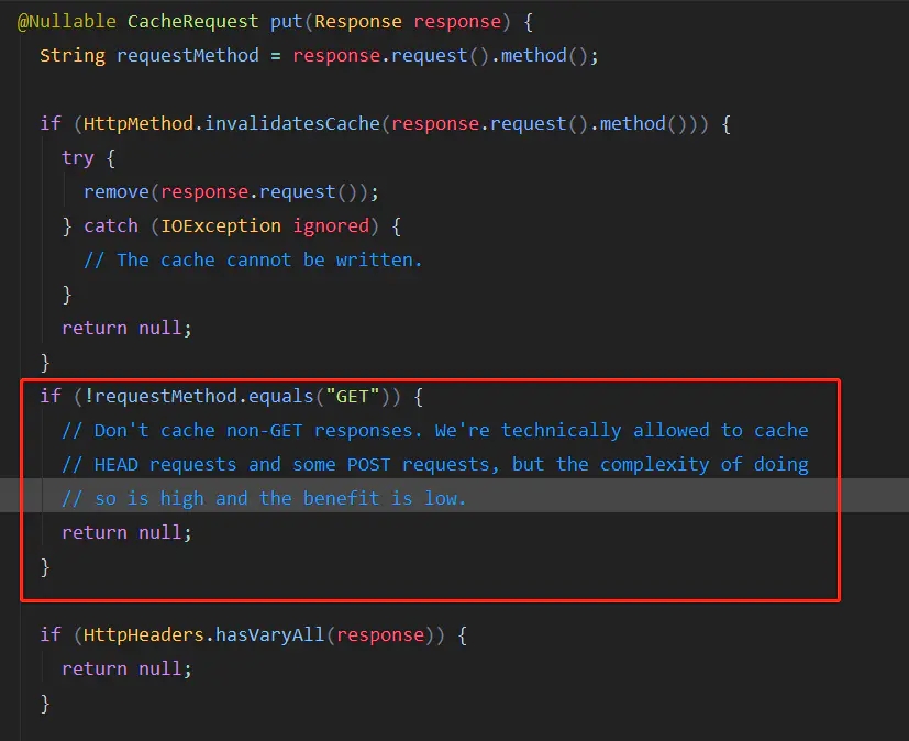 另外,OkHttp的缓存只能用于Get请求。OkHttp的Cache类中,对于GET以外的请求,都返回null。源码中也做出了解释:不允许Get以外的请求,从技术上是允许post请求的。但是他的复杂度很高,实用性太低。