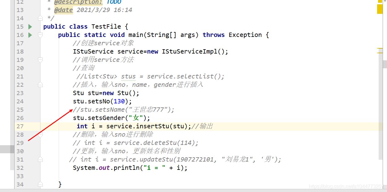 上面是我的Mapper文件、实体类和测试类,方法传的是对象类型的,25行是设置姓名的,现在不设置姓名执行一下实体类