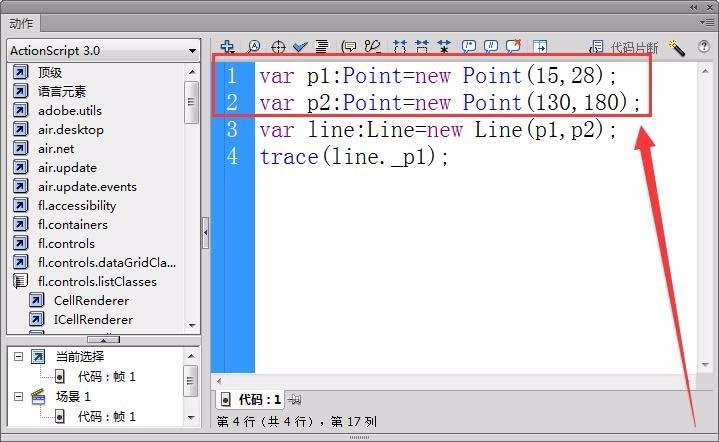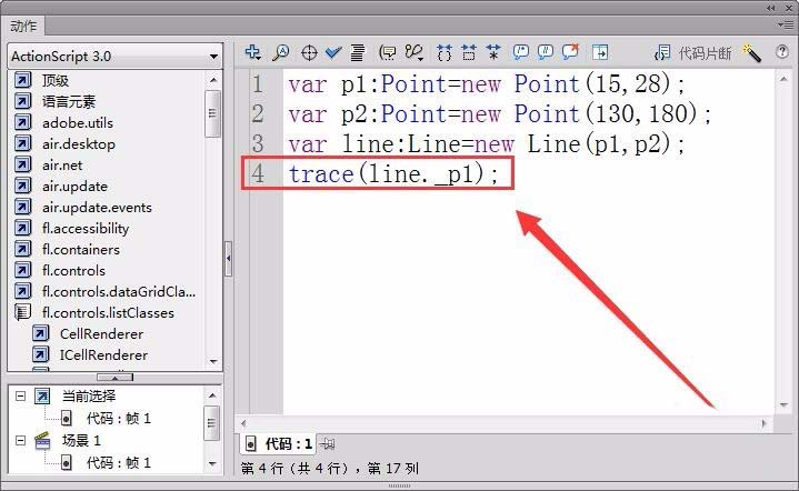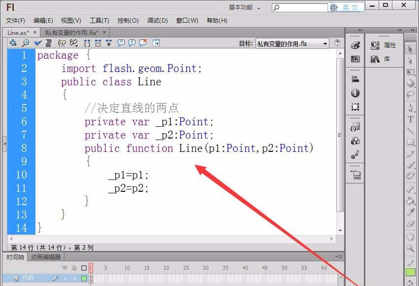 8、回到Flash文件中,将最后一句代码稍加修改,用方法p1来访问私有变更_p1。