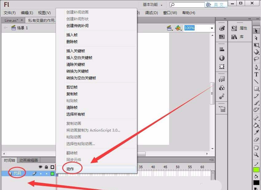 2、新建一个Flash文档,将图层1重命名为代码图层,打开动作面板。