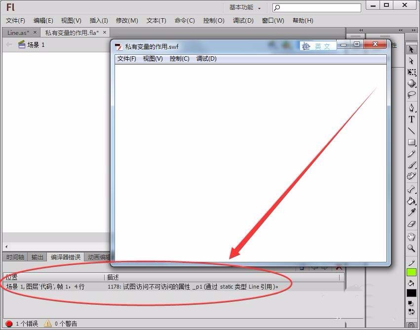 6、运行程序,提示出错信息。这是因为当变量被修饰为private后,只有在定义它的类中才可以使用,fla中的实例或其他类文件都不能访问。