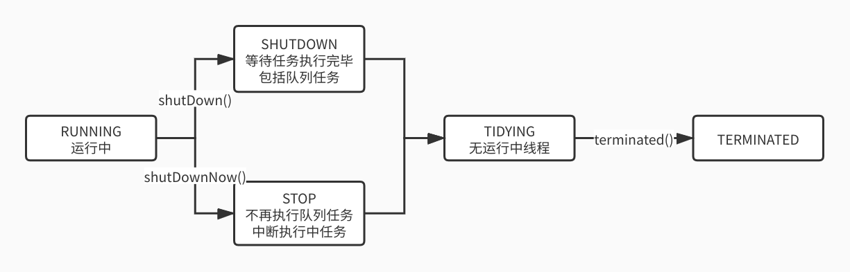 线程池设定了RUNNING、SHUTDOWN、STOP、TIDYING和TERMINATED五种状态,其转移图如下: