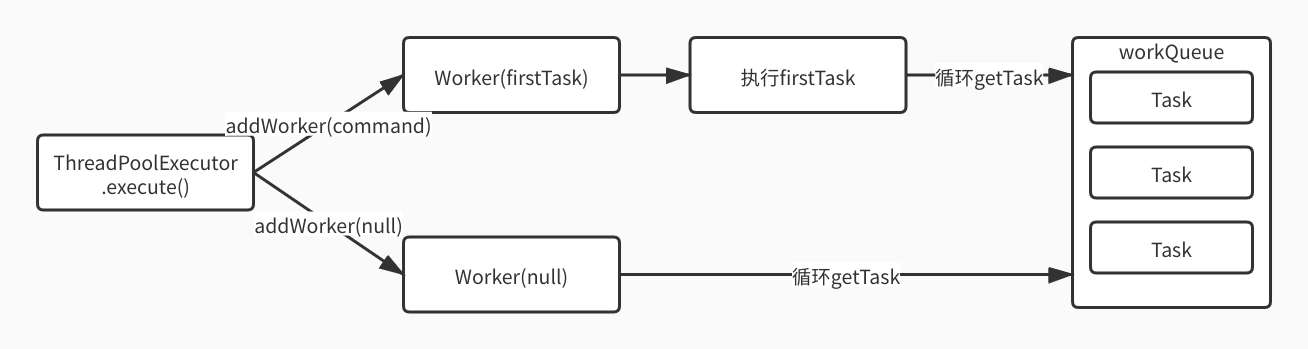 如下图,任务提交后触发addWorker创建worker对象,该对象执行任务完毕后,则循环获取队列中任务等待执行。