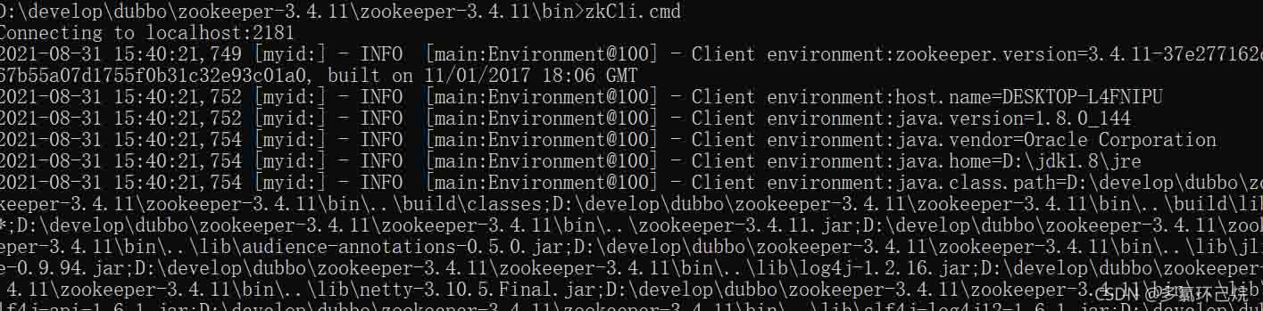 在zookeeper-3.4.11bin目录下运行cmd启动zookeeper客户端: