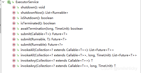 shutdown:已经提交的会执行完成shutdownNow:正在执行的会执行完成,未来执行的返回awaitTermination:阻塞等待任务关闭完成submit类型的:都是提交任务的,支持Runnable和CallableinvokeAll类型的:执行集合中所有任务