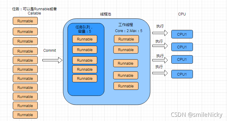 画流程图表示,线程池的核心参数是corePoolSize、maxPoolSize、workQueue(工作队列)