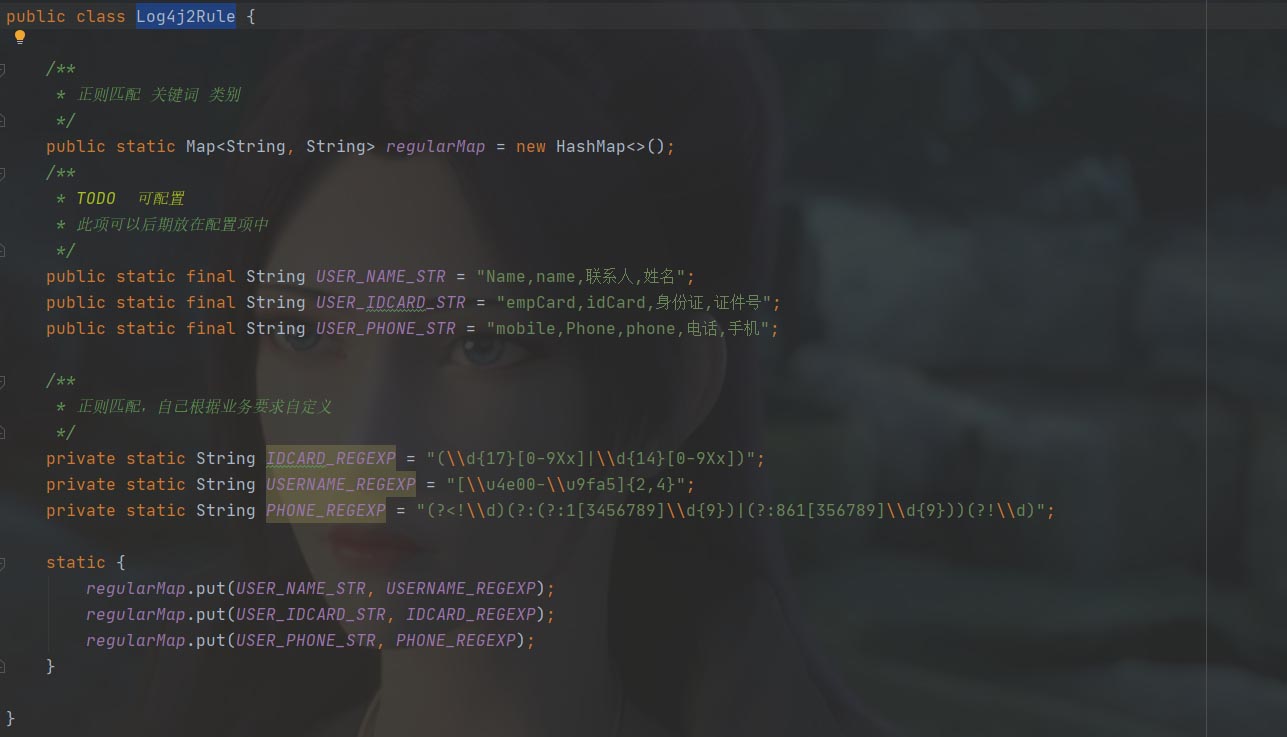 上述代码中的Log4j2Rule则是脱敏规则静态类,我这里是直接放在了静态类中配置,实际项目中可以设置到配置文件中,代码如下:
