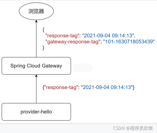 其次是修改响应,如下图,服务提供方provider-hello的原始响应只有response-tag字段,经过网关时被塞入了gateway-response-tag字段,最终浏览器收到的响应就是response-tag和gateway-response-tag两个字段: