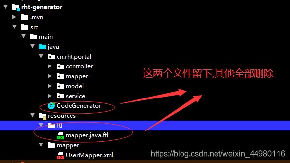最后:也是重要的一点,在您将这些文件复制到了项目模块上的时候,留下CodeGenerator类与文件夹下的mapper.java.ftl配置,其他生成的请及时删除