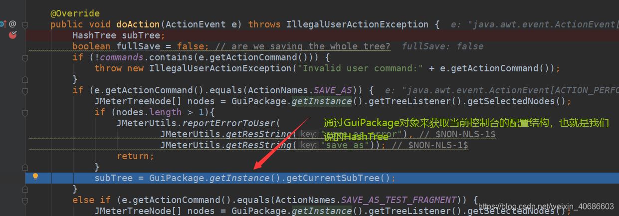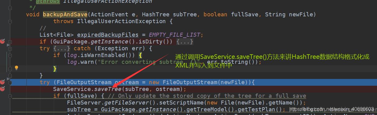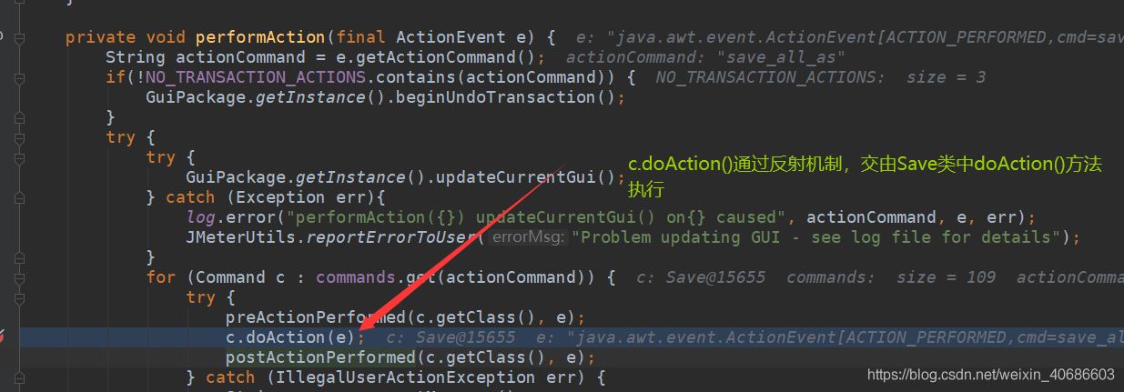 首先在JMeter控制台所有点击事件,都会被ActionRouter中performaAction方法进行监听执行,点击导出按钮,会进入到如图方法通过反射由Save类执行